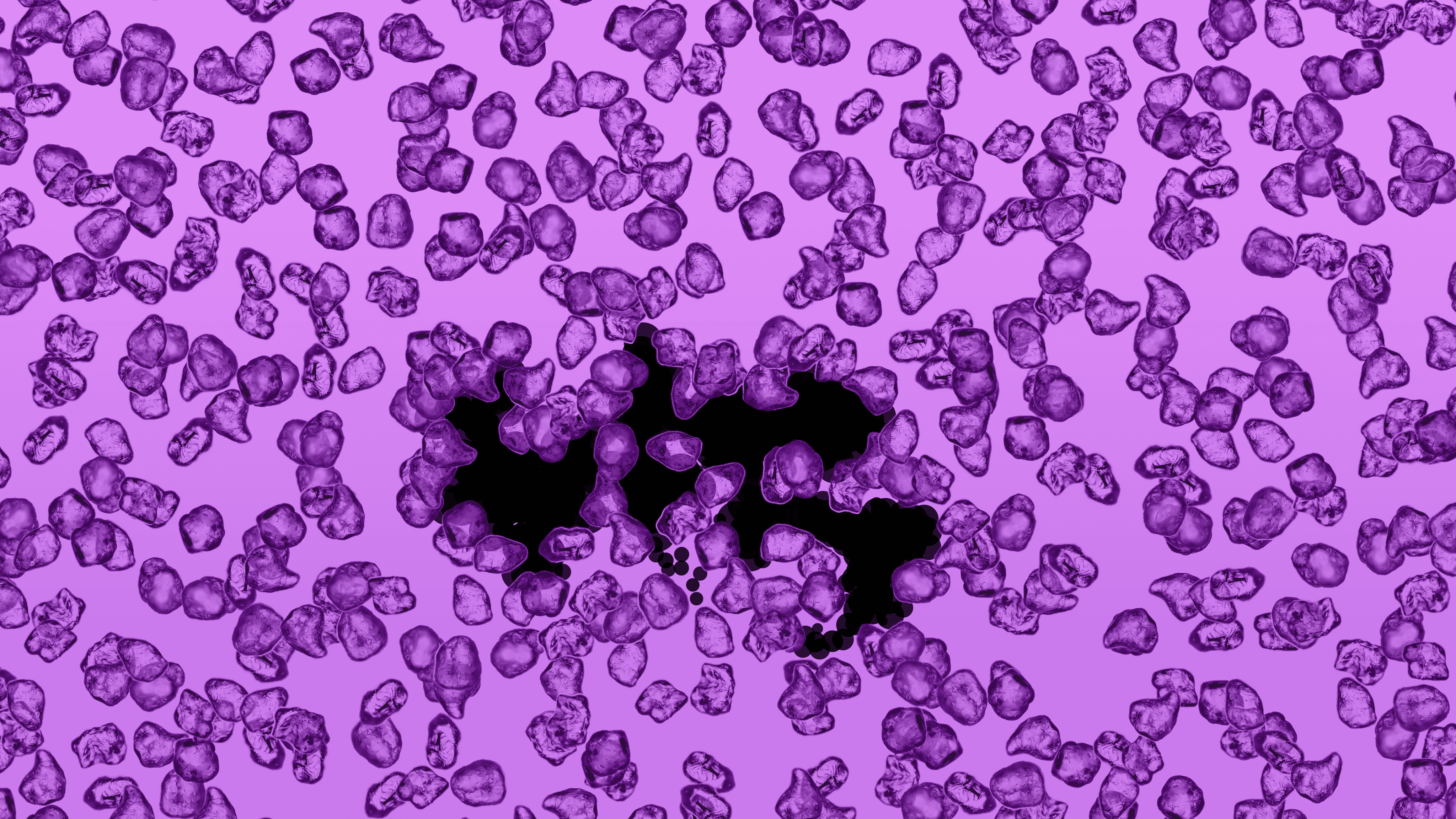 The grains are distributed across the field of view to create an organic looking section of sand. The spaces between the sand form branching paths as they wind their way through the grid, which the invasion percolation algorithm uses to determine flow.