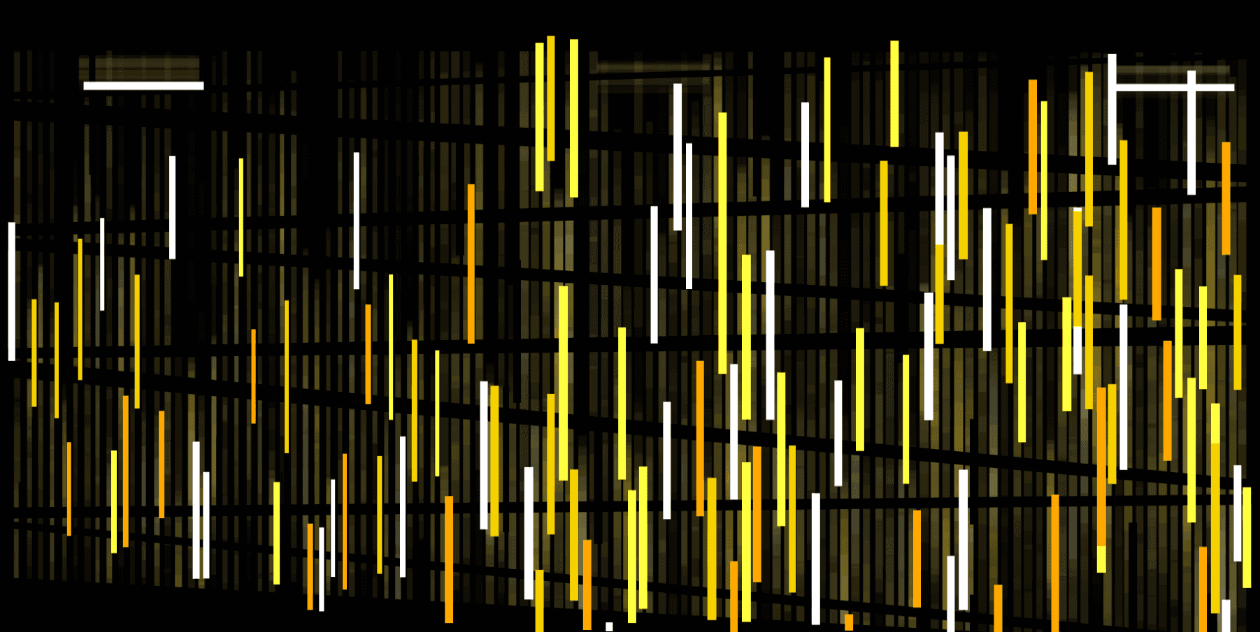 Each vertical bar worked out to be 6px wide after it was mapped from across the hall. From there the vertical orientation of the bars were used to visualize various FFT algorithms using audio from the musicians performing that night.